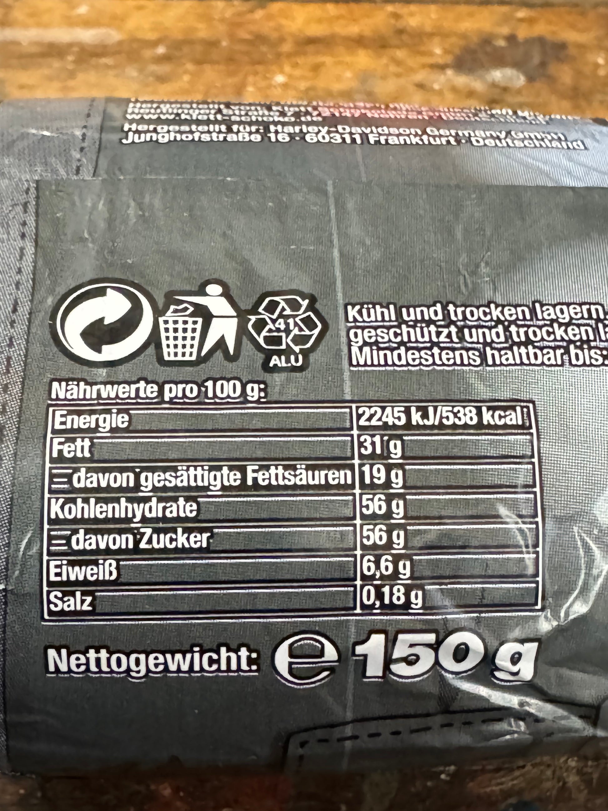 150 g feinste Vollmilchschokolade, handverpackt im unverwechselbaren Harley-Style.